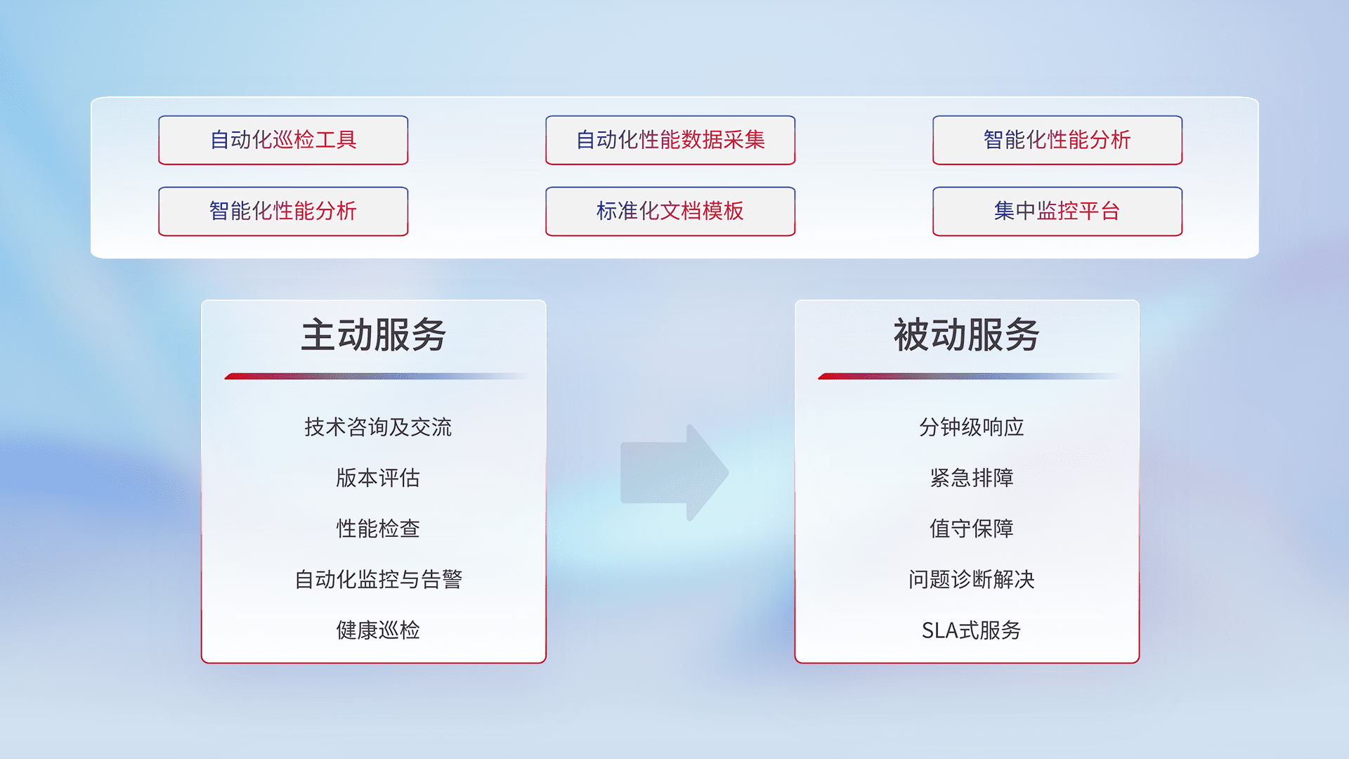 智能化工具和标准化文档,,,保障服务质量,,,提供主动服务(包含技术咨询、、版本评估、、、、性能检查、、、、自动化监控与告警、、、健康巡检)和被动服务包含(分钟级响应、、、、紧急排障、、、值守保障、、问题诊断解决、、SLA服务)。。